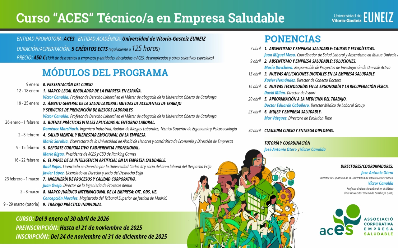 En la jornada de los Premios Empresa Saludable se ha hecho un recordatorio de lo que es un curso pionero en España en cuanto a titulación académica oficial de Técnico en Empresa Saludable, pues este curso cuenta con el aval y reconocimiento académico de la Universidad de Vitoria Gasteiz Euneiz.