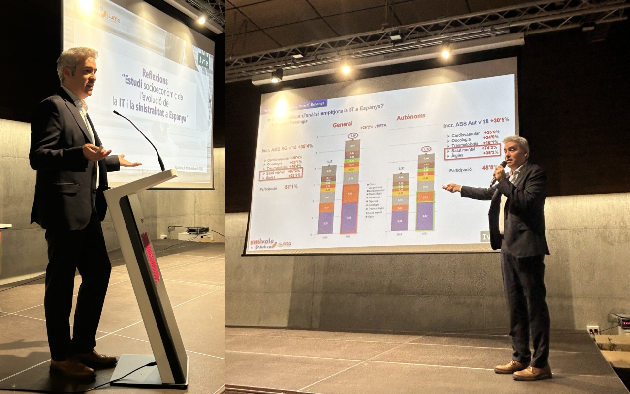 Una brillante exposición del representante de la mutua de accidentes Umivale Activa, Marc Mateo, abrió la jornada de los Premios Empesa Saludable en Igualada. En su exposición desgranó estadísticas hasta ahora desconocidas, dado que es la primera vez que un grupo de investigación ha podido acceder al banco de datos completo de la Seguridad Social en lo que a bajas laborales se refiere.